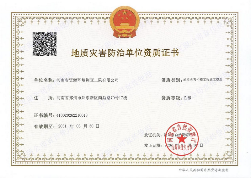 近日,经河南省自然资源厅严格审核、依法批准,河南省资源环境调查二院有限公司成功取得地质灾害治理工程施工乙级资质(证书编号:410020262210013),资质有效期至: 2031 年 3 月 30 日。此次资质获批,标志着我院在地质灾害防治领域的综合服务能力再获权威认可,为进一步拓展地灾治理施工业务、完善 “资源 + 环境” 全产业链布局注入了新动能。