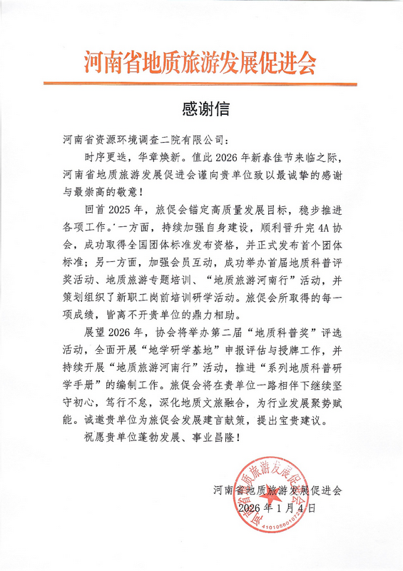 近日,河南省资源环境调查二院有限公司收到了来自河南省地质旅游发展促进会的感谢信。信中,旅促会对我公司在2025年给予的鼎力支持致以. 诚挚的感谢与. 崇高的敬意,并对双方未来的合作寄予殷切期望。