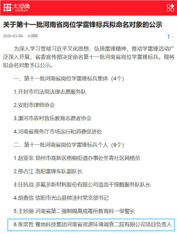 近日,中共河南省委宣传部公布了第十一批河南省岗位学雷锋标兵名单,河南省资源环境调查二院有限公司项目负责张奕哲同志光荣上榜。这位长期奋战在生态保护修复最前线的地质工作者,以其满腔热忱、过硬本领和奉献精神,生动诠释了新时代的雷锋精神与劳模工匠风采。
