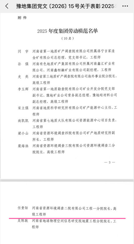 近日,集团党委表彰2025年度集团劳动模范,我公司工程一分院院长、高级工程师任贵阳同志荣获集团劳动模范荣誉称号。