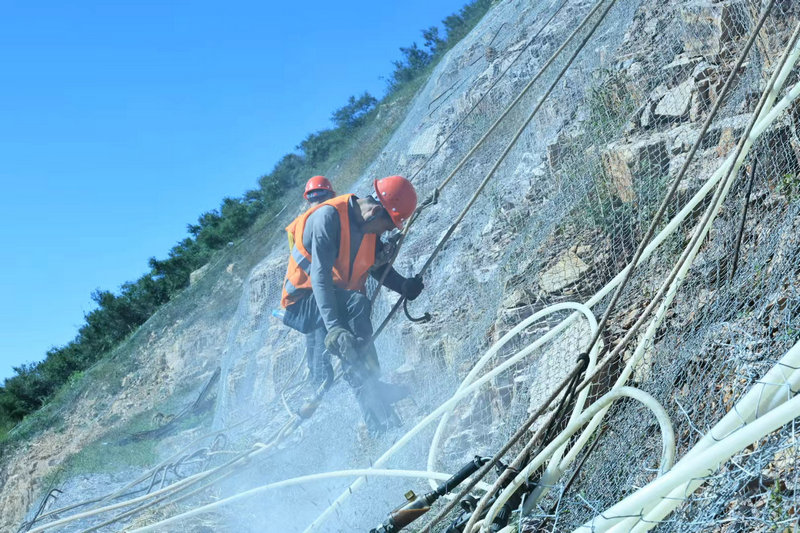 按下快门的瞬间,风从山谷里吹来,带着草木的淡淡清新,吹起了工人师傅红色工装的衣角,为原野增添了一种别样的景致。他似是察觉到我的紧张的目光,似乎在告诉我不要怕,抬头朝我挥了挥手,安全帽下的笑容被阳光镀上一层暖光。随后又低头专注于手中的活计——指尖在钢丝网与锚杆间翻飞,每一个动作都沉稳得像在雕琢一件珍宝。