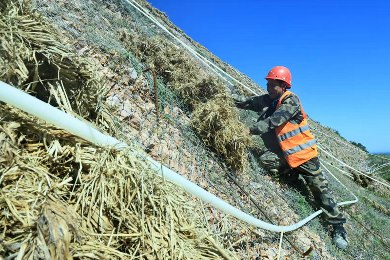 待我们沿着绳索慢慢下山,回望那片护坡,红色的身影仍在半空中移动,像跳动的火焰,又像撒在山野间的朱砂。无人机还在往返运送着材料,风钻的轰鸣声渐渐与风声相融,不再刺耳,反倒成了这片山谷里最生动的劳动乐章。