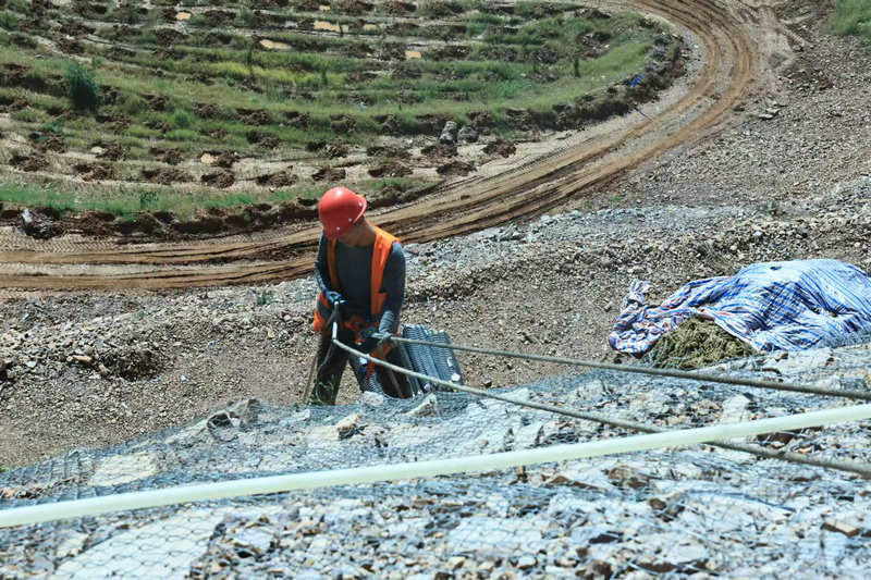 “看,还有一位施工人员在下面作业呢!”我们往下一看,距离地面二十多米的一层平台坡面,安全绳索将一位施工人员吊在半空中,双手并用在坡面上加固着一片挂网,我举着相机找准角度要为师傅拍一张这种场合的劳动镜头,看着下面深深的坡底,我的双腿不禁有些发抖,我心里暗暗叮嘱自己:别怕,工人师傅在半空作业都不怕,你怕个啥。